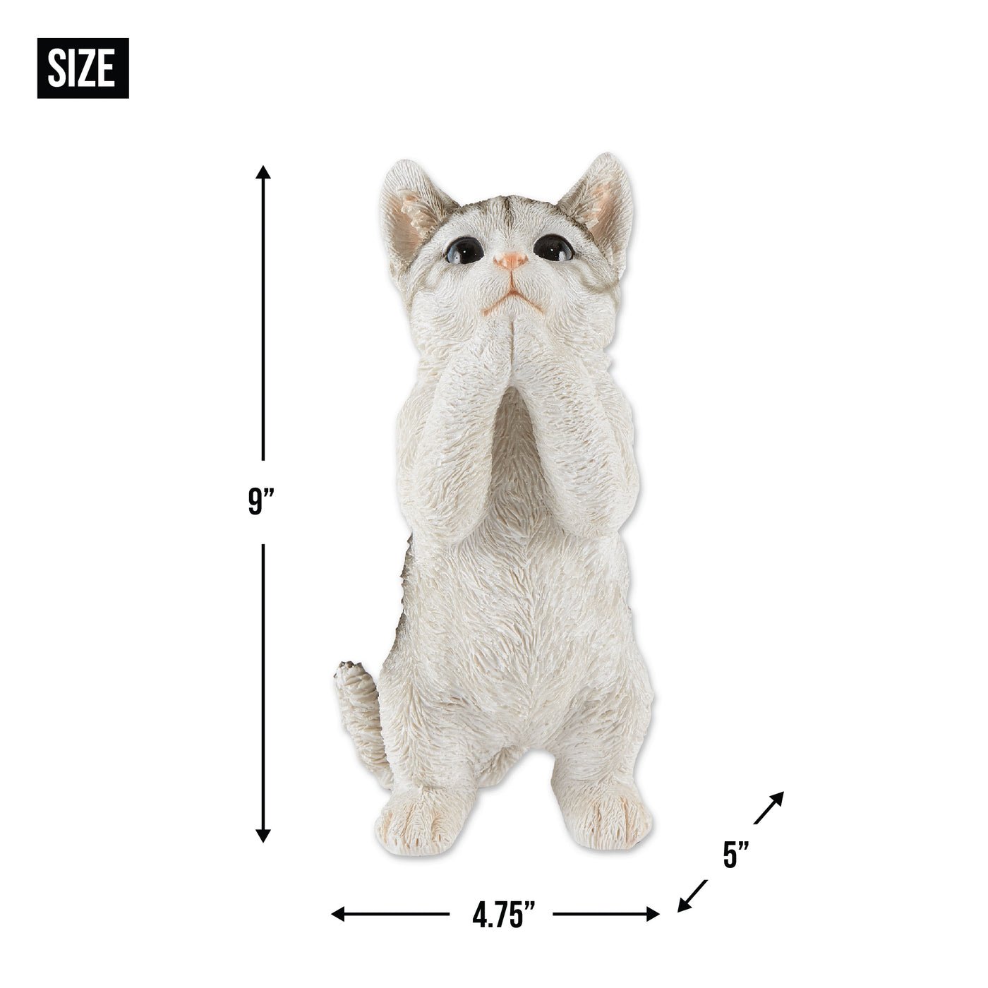 Kitty cat figurine features a realistic depiction of an adorable cat standing. A sweet addition to your front or backyard garden, or indoors as well. Eyes and fur look amazingly lifelike. 0.88 pound. 4.75 x 5 x 9 inches tall. Polyresin.